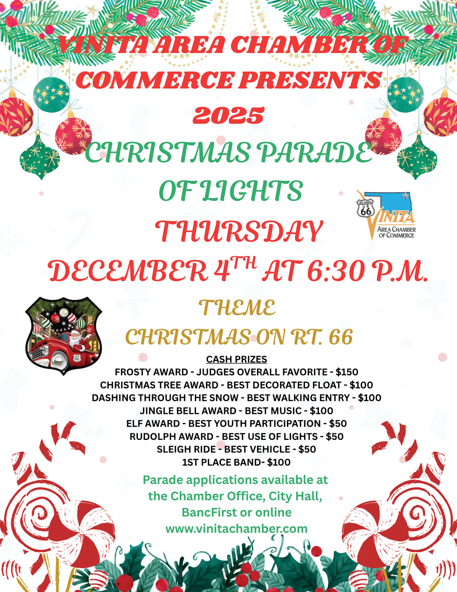 Celebrate the season in small-town style as Vinita lights up the night with its beloved annual Christmas Parade of Lights! This yearβs theme, Christmas on Rt. 66, invites businesses, schools, and local organizations to deck their floats in nostalgic holiday cheer and Route 66 charm.