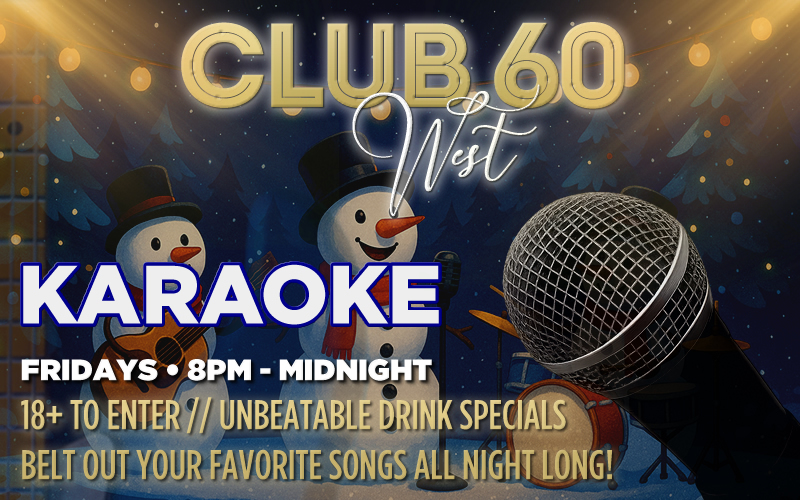 Step into the spotlight with Karaoke in Club 60 West! On Friday, Club 60 West opens at 6pm with your favorite Drink Specials, then DJ Kay makes you the star with karaoke from 8pm to Midnight!