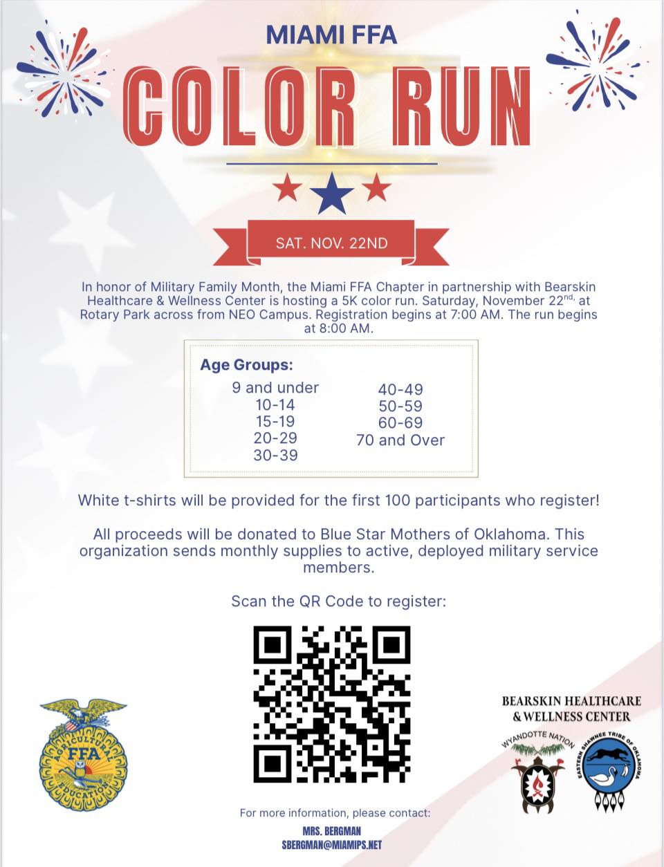 Join the Miami FFA Chapter and Bearskin Healthcare & Wellness Center for a patriotic 5K Color Run in celebration of Military Family Month! This family-friendly event welcomes participants of all ages and fitness levels with age groups ranging from 9 and under to 70+.