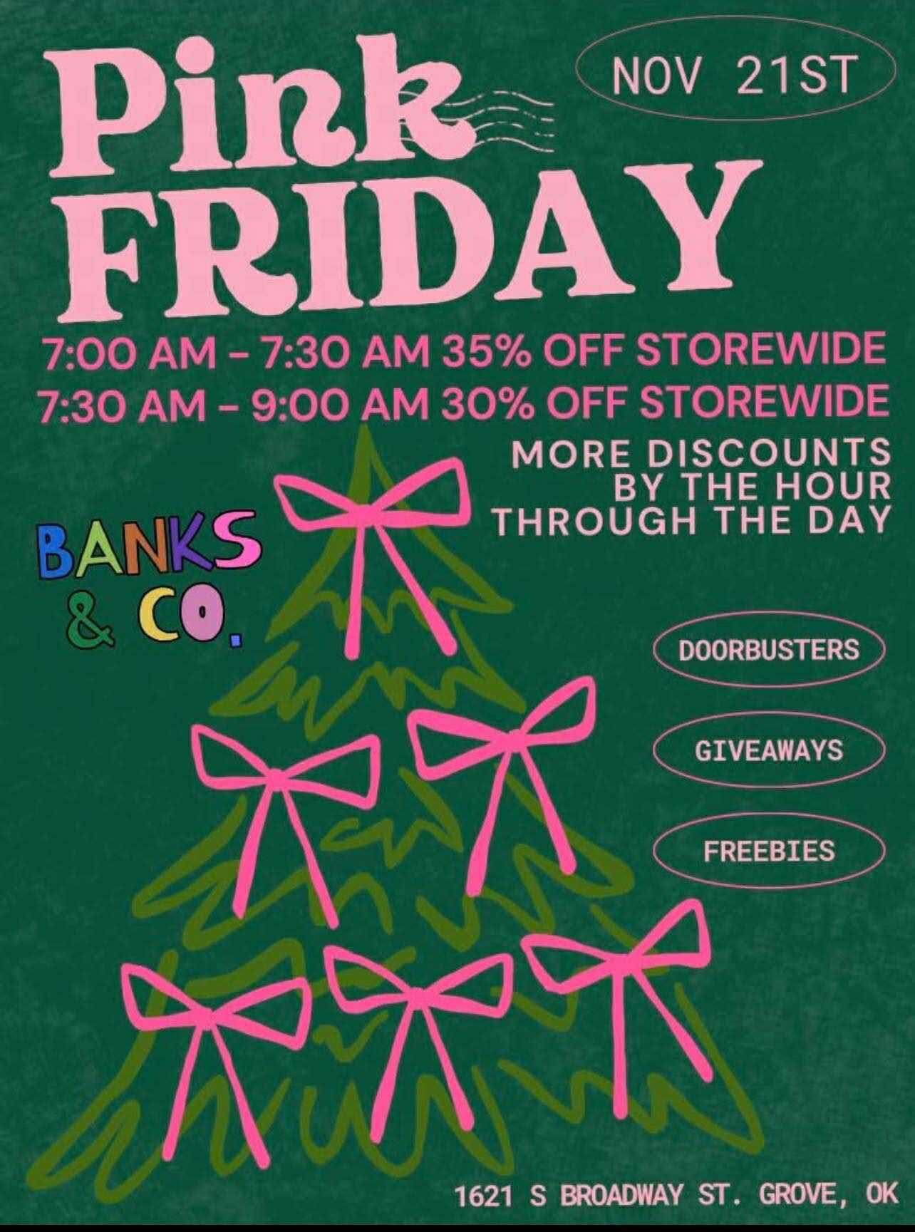 Kick off the holiday shopping season early with Pink Friday at Banks & Co.! π Enjoy exclusive storewide discounts, giveaways, freebies, and festive vibes all day long.