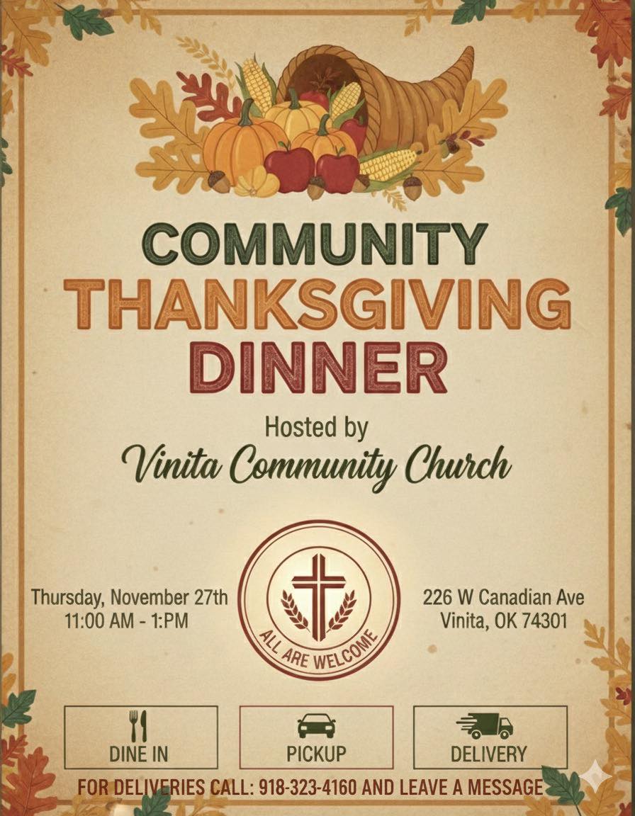 This Thanksgiving, all are welcome to join Vinita Community Church for a warm and hearty Community Thanksgiving Dinner β a time to share a meal, connect with neighbors, and celebrate gratitude together.