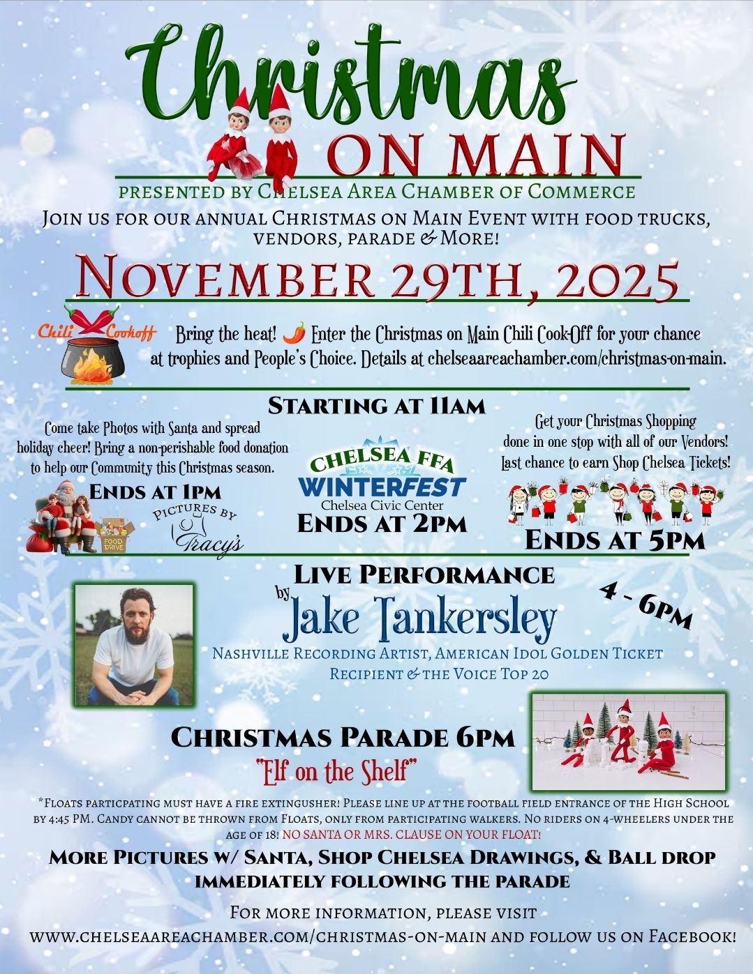Kick off the holiday season at Chelseaβs annual Christmas on Main β a full day of festive fun including food trucks, vendors, photos with Santa, live music, a chili cook-off, parade, and more!